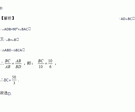 如图,在Rt△ABC,∠BAC=90°,AD⊥BC,AB=10,BD=6,则BC的值为( )