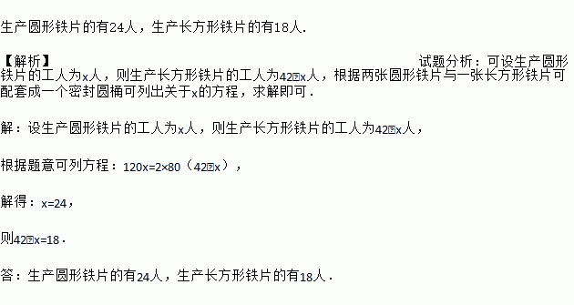 油桶制造厂的某车间主要负责生产制造油桶用的的圆形铁片和长方形铁片,该车间有工人42人,每个工人平均每小时可以生产圆形铁片120片或者长方形铁片80片.如图,一个油桶由两个圆形铁片和一个长方形铁片相配套. 生产圆形铁片和长方形铁片的工人各为多少人时,才能使生产的铁片恰好配套?