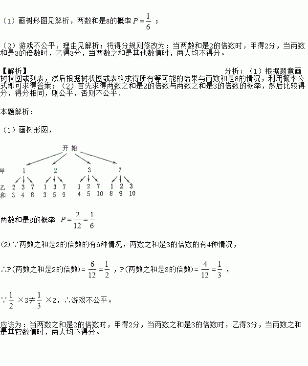 (2)甲、乙两人想用这种方法做游戏,他们规定:若两数之和是2的倍数时,甲得3分;若两数之和是3的倍数时,乙得2分;当两数之和是其他数值时,两人均不得分.你认为这个游戏公平吗?请说明理由;若你认为不公平,请你修改得分规则,使游戏公平。