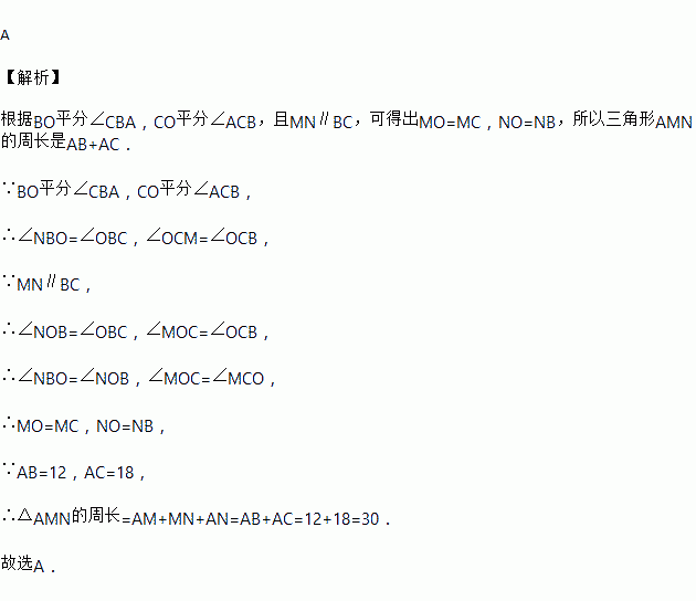 如图,BO平分∠ABC,CO平分∠ACB,且MN∥BC,设AB=12,BC=24,AC=18,则△AMN的周长为( )