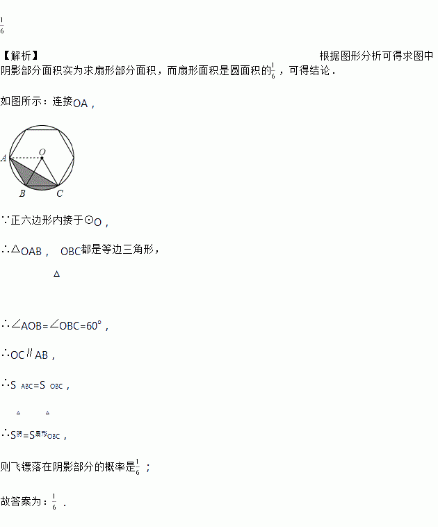 如图,正六边形内接于⊙O,小明向圆内投掷飞镖一次,则飞镖落在阴影部分的概率是__.
