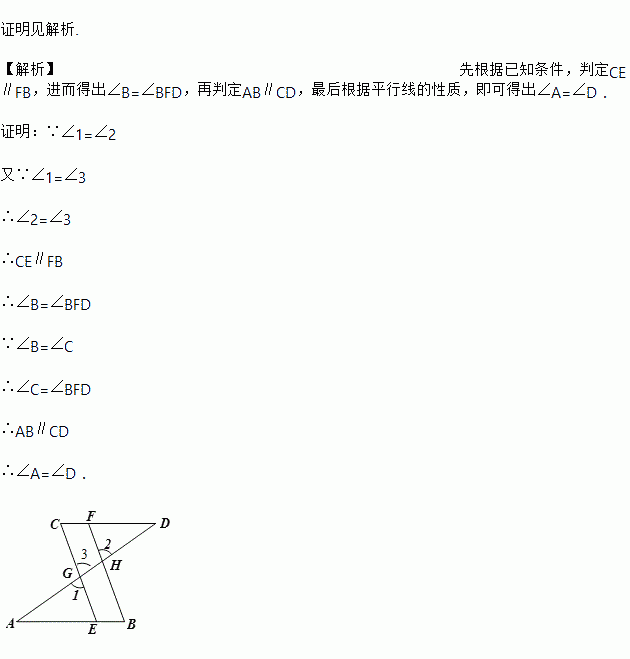 已知如图,∠1=∠2,∠B=∠C, 求证:∠A=∠D.