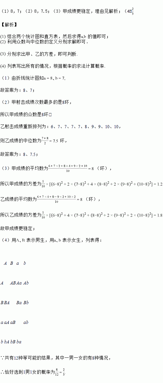 乙的成绩(环) | 6 | 7 | 9 | 7 | 9 | 10 | 8 | 7 | b | 10 |