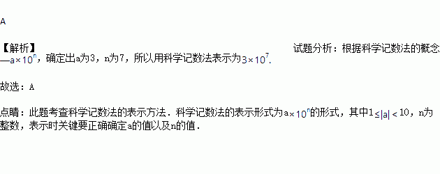 人类的遗传物质是DNA,人类的DNA是条很长的链,最短的21号染色体也有30000000个核苷酸,这个数字用科学记数法可表示为 ( )