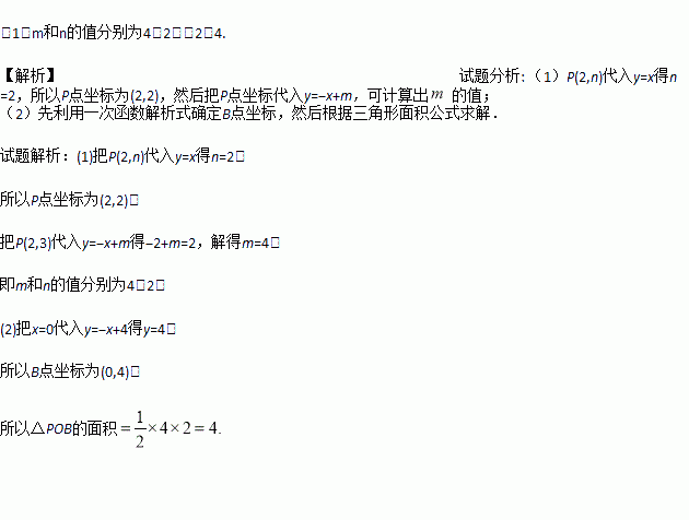 如图,一次函数y=-x+m的图象和y轴交于点B,与正比例函数y=x图象交于点P (2,n).