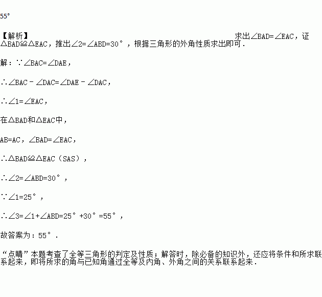 如图所示, AB=AC,AD=AE,∠BAC=∠DAE,∠1=25°,∠2=30°,则∠3=_____.