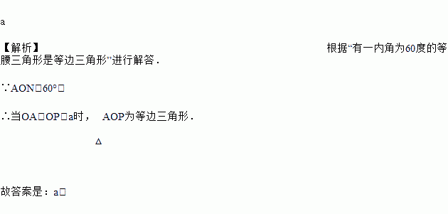 如图已知OA=a,P是射线ON上一动点,∠AON=60°,当OP=________ 时,△AOP为等边三角形.