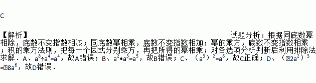 A. a8÷a4=a2 B. a2•a3=a6 C. (a3)2=a6 D. (﹣2a2)3=8a6