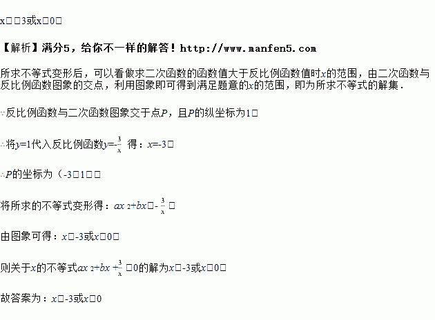 如图,已知函数y=﹣与y=ax2+bx(a>0,b>0)的图象交于点P,点P的纵坐标为1,则关于x的不等式bx+> 的解集为_____.