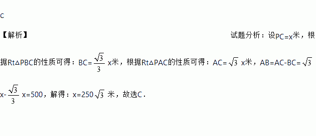 如图,小明同学在东西方向的环海路A处,测得海中灯塔P在北偏东60°方向上,在A处东500米的B处,测得海中灯塔P在北偏东30°方向上,则灯塔P到环海路的距离PC=( )米.