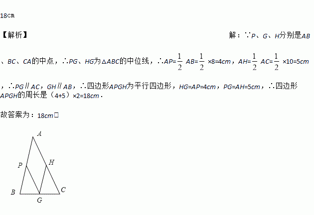 在△ABC中,AB=8 ㎝,AC=10 ㎝,P,G,H分别是AB,BC,CA的中点,则四边形APGH的周长是______ .