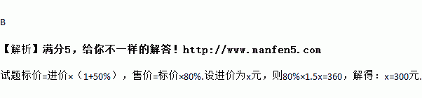一家服装店将某种服装按进价提高50%后标价,又以八折销售,售价为360元,则每件服装的进价是( )