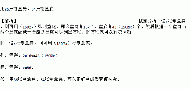 用白铁皮做罐头盒,每张铁片可制盒身16个或制盒底43个,一个盒身与两个盒底配成一套罐头盒,现有150张白铁皮,用多少张制盒身,多少张制盒底,可以正好制成整套罐头盒?