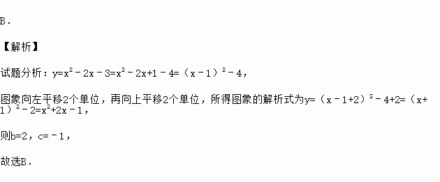 B. 【解析】 试题分析:y=x2﹣2x﹣3=x2﹣2x+1﹣4=(x﹣1)2﹣4, 图象向左平移2个单位,再向上平移2个单位,所得图象的解析式为y=(x﹣1+2)2﹣4+2=(x+1)2﹣2=x2+2x﹣1, 则b=2,c=﹣1, 故选B.