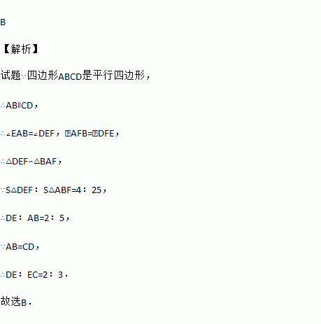如图所示,在平行四边形ABCD中,E为CD上一点,连接AE,BD,且AE,BD交于点F,S△DEF:S△ABF=4:25,则DE:EC=( )