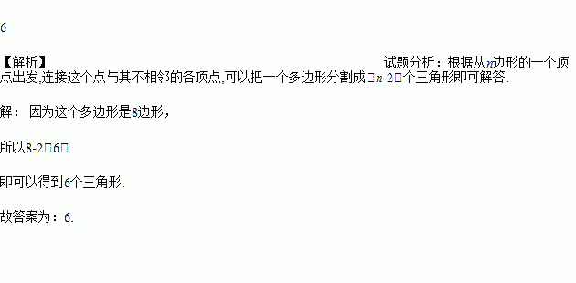 一个多边形有8条边,从其中的一个顶点出发,连接这个点和其他顶点,可以得到_____ 个三角形.