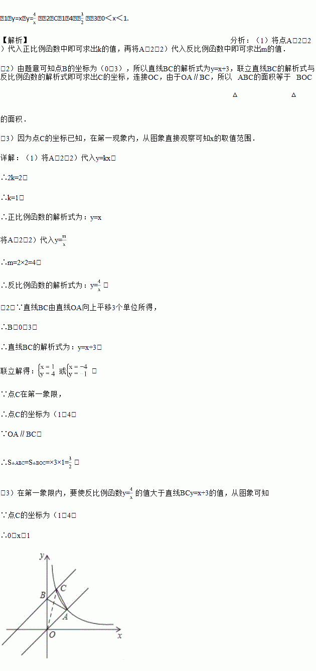 (2)将直线OA向上平移3个单位长度后与y轴交于点B,与反比例函数图象在第一象限内的交点为C,连接AB,AC,求点C的坐标及△ABC的面积;
