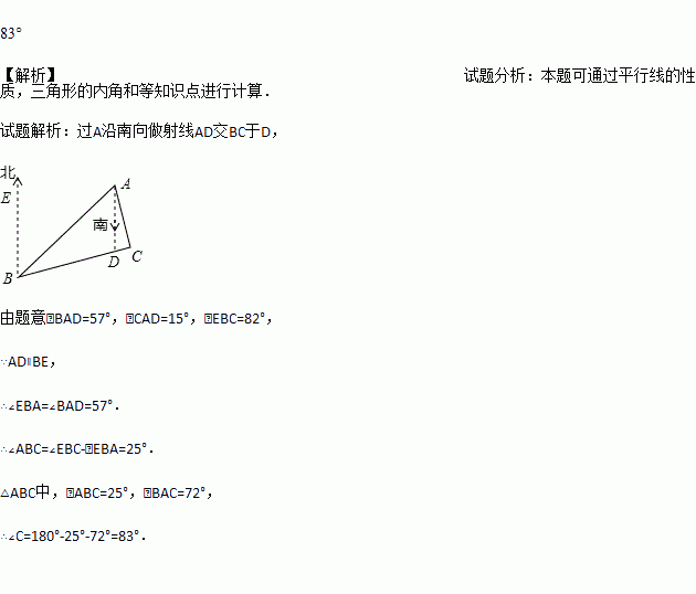 如图,经测量,B处在A处的南偏西57°的方向,C处在A处的南偏东15°方向,C处在B处的北偏东82°方向,求∠C的度数.