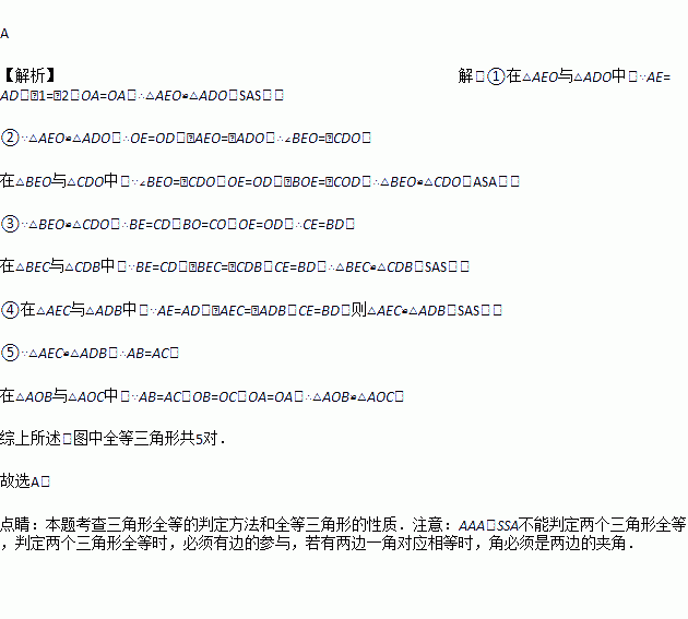 如图,在AB、AC上各取一点E、D,使AE=AD,连接BD、CE相交于点O,再连接AO、BC,若∠1=∠2,则图中全等三角形共有( )