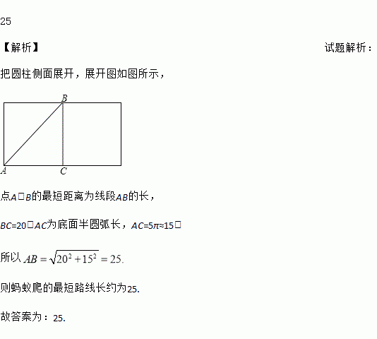 如图,有一个圆柱体,它的高为20,底面半径为5.如果一只蚂蚁要从圆柱体下底面的A点,沿圆柱表面爬到与A相对的上底面B点,则蚂蚁爬的最短路线长约为______( 取3)