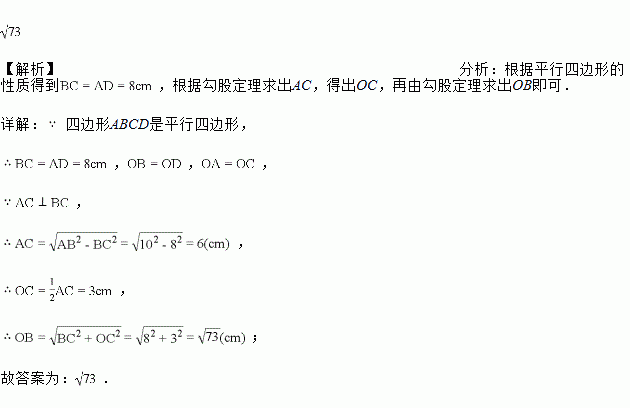 在?ABCD中,点O是对角线AC、BD的交点,AC垂直于BC,且,,则______cm.