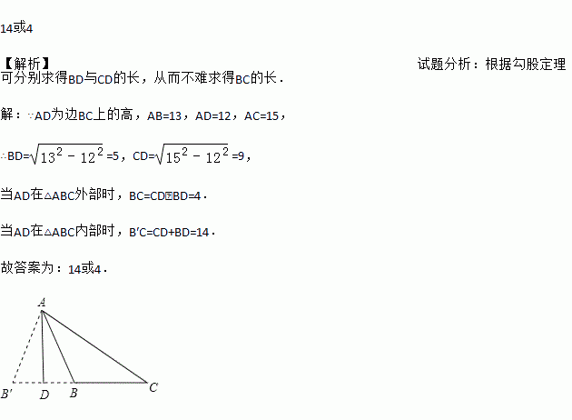 在△ABC中,AB=13,AC=15,高AD=12,则BC的长为 .