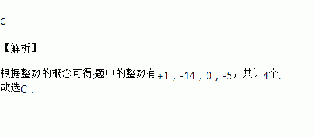 在下列数-,+1,6.7,-14,0,, -5 中,属于整数的有( )