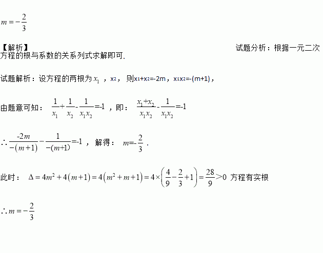 【解析】试题分析:根据一元二次方程的根与系数的关系列式求解即可. 试题解析:设方程的两根为,x2, 则x1+x2=-2m,x1x2=-(m+1), 由题意可知: ,即: ∴, 解得: . 此时: 方程有实根 ∴