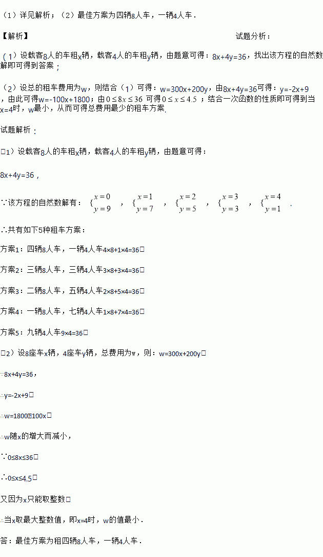 (1)详见解析;(2)最佳方案为四辆8人车,一辆4人车. 【解析】试题分析: (1)设载客8人的车租x辆,载客4人的车租y辆,由题意可得:8x+4y=36,找出该方程的自然数解即可得到答案; (2)设总的租车费用为w,则结合(1)可得:w=300x+200y,由8x+4y=36可得:y=-2x+9,由此可得w=-100x+1800;由可得;结合一次函数的性质即可得到当x=4时,w...