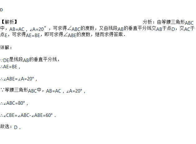 如图,等腰三角形ABC中,AB=AC,∠A=20°,线段AB的垂直平分线交AB于点D,交AC于点E,连接BE,则∠CBE等于( )