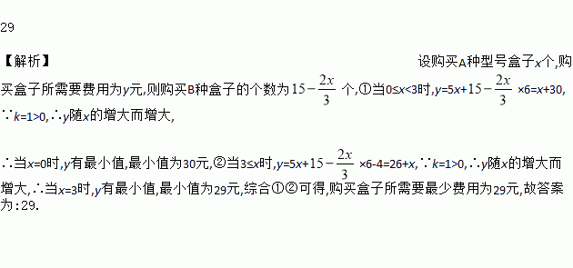 (黄石中考)一食堂需要购买盒子存放食物,盒子有A,B两种型号,单个盒子的容量和价格如表所示,现有15升食物需要存放且要求每个盒子要装满,由于A型号盒子正做促销互动:购买三个及三个以上可一次性返现金4元,则购买盒子所需要最少费用为_______元.