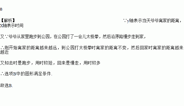 小张的爷爷每天坚持体育锻炼,星期天爷爷从家里跑步到公园,打了一会太极拳,然后沿原路慢步走到家,下面能反映当天爷爷离家的距离y(米)与时间t(分钟)之间关系的大致图象是( )