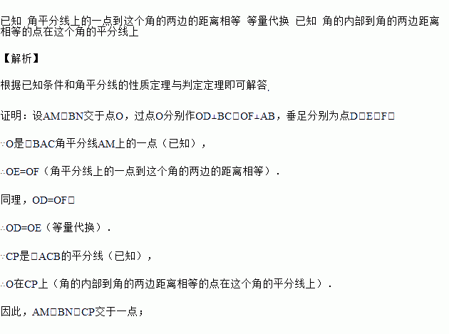 证明:如图,设AM,BN交于点O,过点O分别作OD⊥BC,OF⊥AB,垂足分别为点D,E,F.