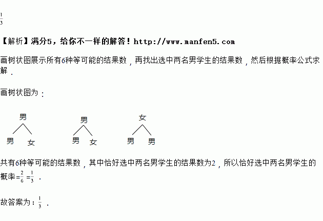 武汉二中广雅中学开展“广学雅行”活动,从学生会“监察部”的三名学生干部(2男1女)中随机选两名进行活动督查,恰好选中两名男学生的概率是_____.