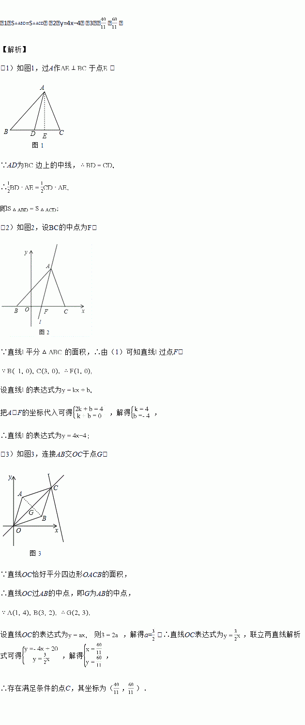(3)如图3,在平面直角坐标系中,如果A(1,4),B(3,2),那么在直线y=–4x+20上是否存在一点C,使直线OC恰好平分四边形OACB的面积?若存在,请计算点C的坐标;若不存在,请说明理由.