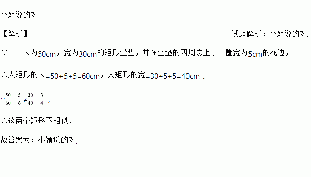 小颖的妈妈为小颖缝制了一个长50cm,宽30cm的矩形坐垫,又在坐垫的周围缝上一圈宽3cm的花边,妈妈说:“里外两个矩形是相似形”,小颖说:“这两个矩形不是相似形”,你认为谁说得对?并说明你的理由(___________________)