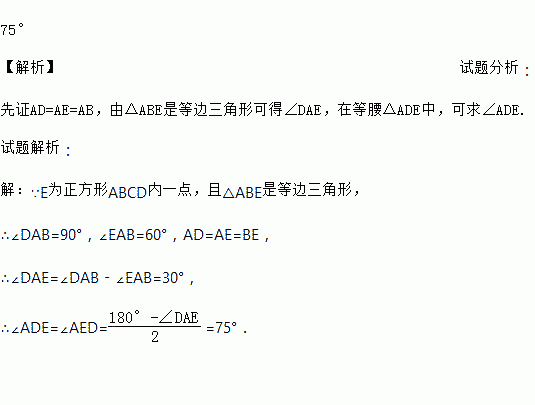 如图所示,点E为正方形ABCD内部的一点,且△ABE为等边三角形,试求∠ADE的度数.