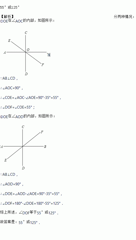 已知AB⊥CD,垂足为O,EF经过点O,∠AOE=35°,则∠DOF等于_________.