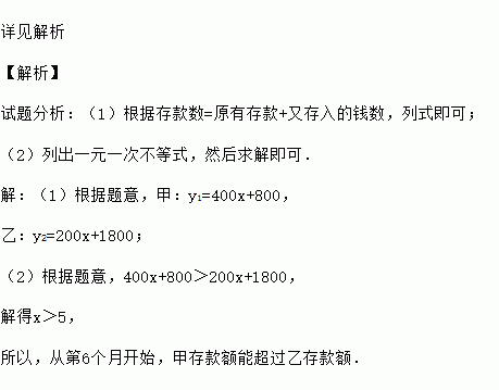 甲、乙原有存款800元和1800元,从本月开始,甲每月存400元,乙每月存200元.如果设两人存款时间为x月.甲存款额是y1元,乙存款额是y2元.