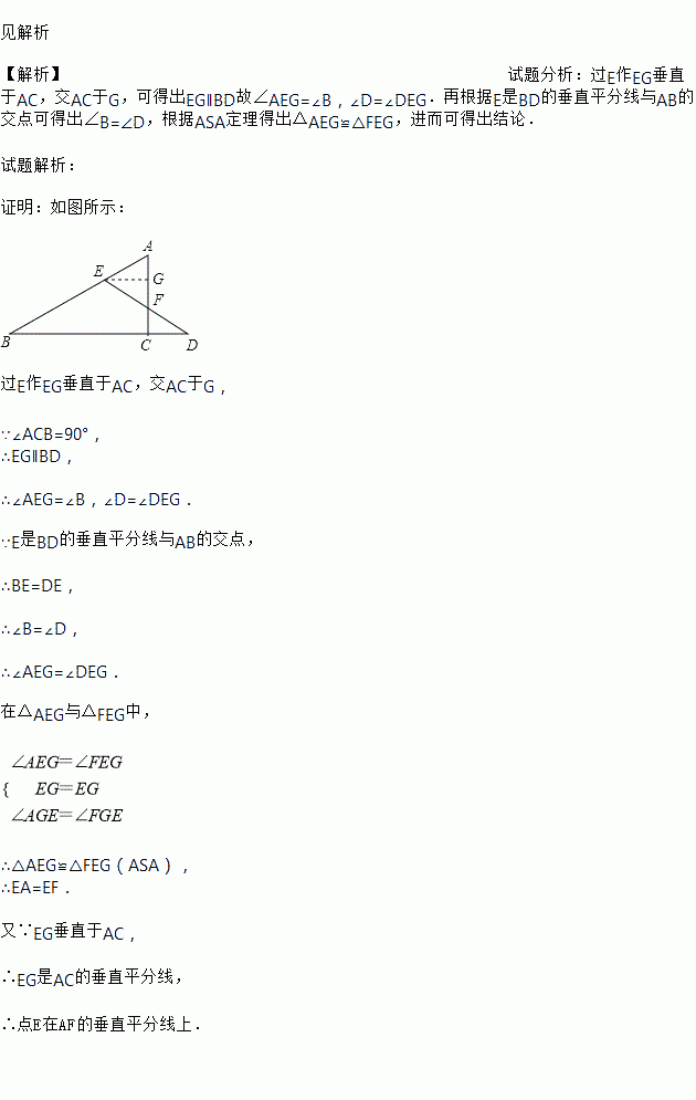 Èçͼ£¬ÔÚ¡÷ABCÖУ¬¡ÏACB£½90¡ã£¬DÊÇBCÑÓ³¤ÏßÉÏÒ»µã£¬EÊÇBD´¹Ö±Æ½·ÖÏßÓëABµÄ½»µã£¬DE½»ACÓÚµãF.ÇóÖ¤£ºµãEÔÚAFµÄ´¹Ö±Æ½·ÖÏßÉÏ£®