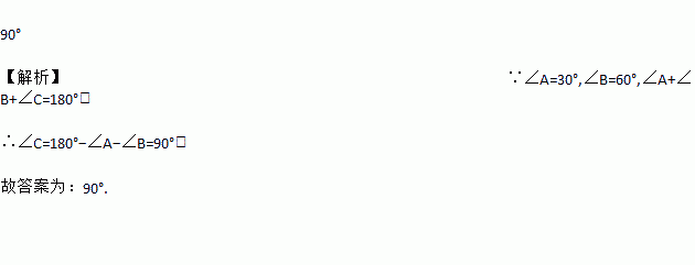 在△ABC中,∠A=30°,∠B=60°,则∠C= 。