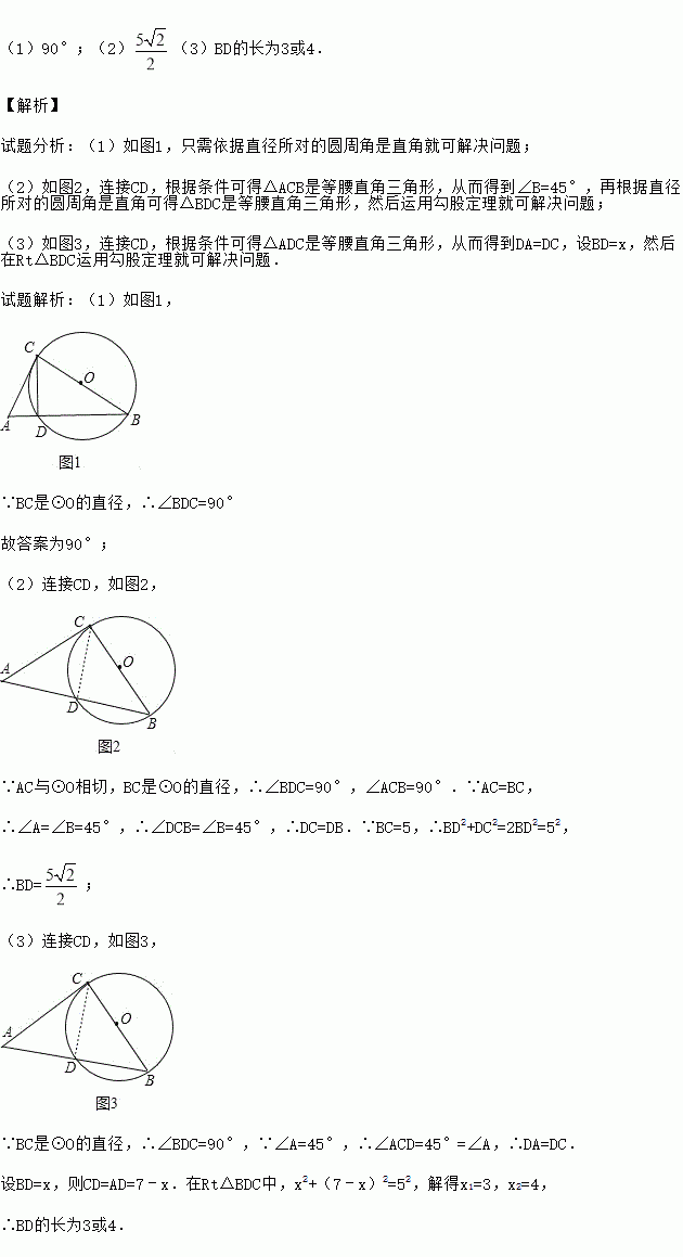 (3)如图3,若∠A=45°,且AB=7,求BD的长.