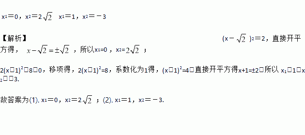方程(x-)2=2的解是______________________,方程2(x+1)2-8=0的解是____________________.