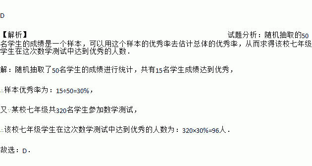 某校七年级共320名学生参加数学测试,随机抽取50名学生的成绩进行统计,其中15名学生成绩达到优秀,估计该校七年级学生在这次数学测试中达到优秀的人数大约有( )