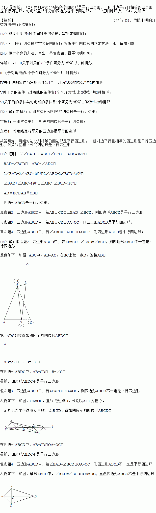 (2)小红认为有4种情形是平行四边形的判定依据.请你写出其它的三个判定定理.