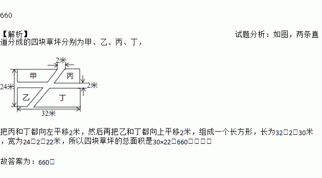 如图,有一块长为32 m、宽为24 m的长方形草坪,其中有两条直道将草坪分为四块,则分成的四块草坪的总面积是________m2.