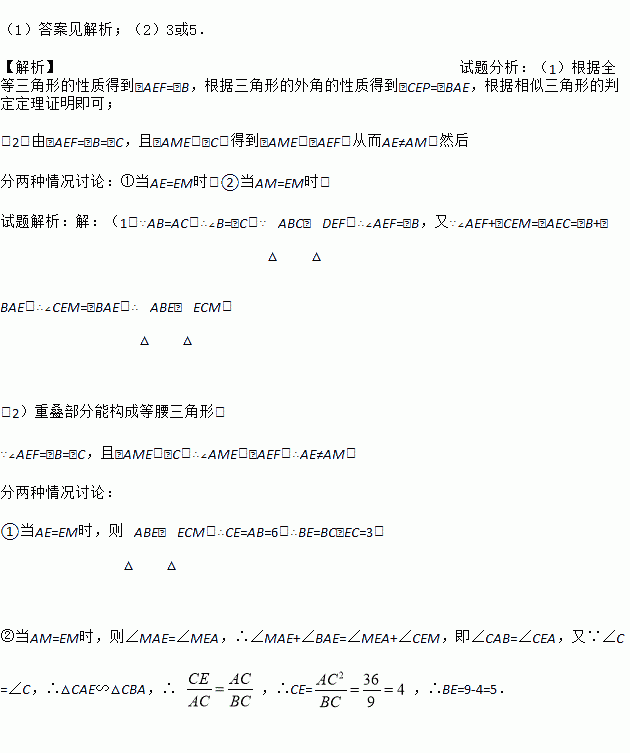 如图,在△ABC中,已知AB=AC=6,BC=9,且△ABC≌△DEF,将△DEF与△ABC重合在一起,△ABC不动,△DEF运动,并满足:点E在边BC上沿B到C的方向运动,且DE始终经过点A,EF与AC交于M点.