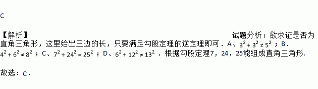 C 【解析】试题分析:欲求证是否为直角三角形,这里给出三边的长,只要满足勾股定理的逆定理即可.A、;B、;C、;D、.根据勾股定理7,24,25能组成直角三角形. 故选:C.