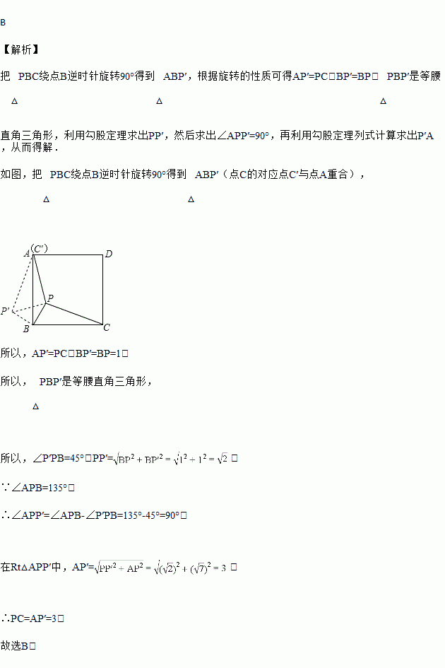 如图,P是正方形ABCD内一点,∠APB=135 , BP=1,AP=,求PC的值( )