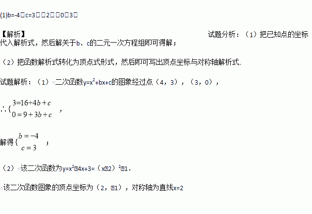 二次函数y=x2+bx+c的图象经过点(4,3),(3,0).